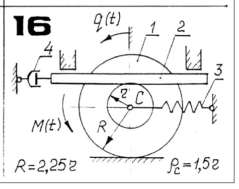 На всех схемах номерами 1, 2 обозначены звенья, массу которых необходимо учитывать при составлении дифференциального уравнения, номером 3 - упругий элемент, номером 4 - демпфер. Силы и моменты воздействия упругих элементов на тела пропорциональны удлинению пружин или углу закручивания спиральных пружин. Демпфер создает силу линейно-вязкого сопротивления R vп    4 , пропорциональную скорости движения поршня п v , где μ4 > 0 - коэффициент сопротивления демпфера. Там, где это необходимо, на схемах вариантов указан радиус инерции звена относительно центральной оси, в остальных вариантах тела вращения принять за однородные сплошные цилиндры. В вариантах 1,2,3,4, 9, 21, 27 характеристики упругих элементов заданы через их статические деформации 3 ст , (линейные или угловые).