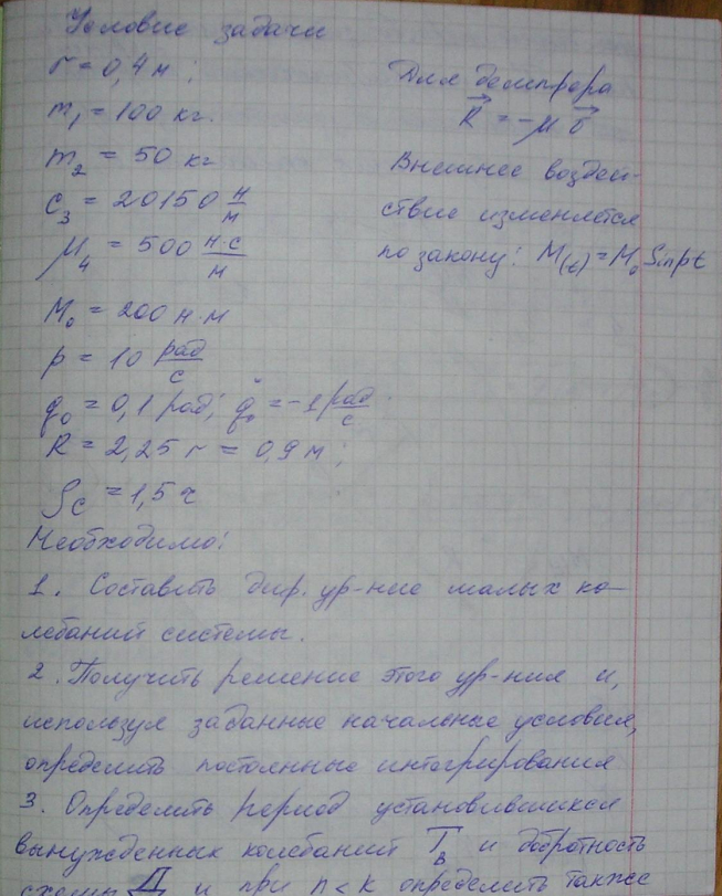 Внешнее воздействие во всех вариантах изменяется во времени по закону sinpt. При выполнении домашнего задания \"Малые колебания - определение параметров колебательного процесса\" необходимо: 1. Составить дифференциальное уравнение малых колебаний системы. 2. Получить решение этого уравнения и, используя заданные начальные условия, определить постоянные интегрирования. 3. Определить период установившихся вынужденных колебаний Tв и добротность системы Д, а для вариантов с малым линейно-вязким сопротивлением (n < k ) дополнительно: Т1 - условный период затухающих колебаний, δ - логарифмический декремент колебаний, τ0- постоянную времени затухающих колебаний.
