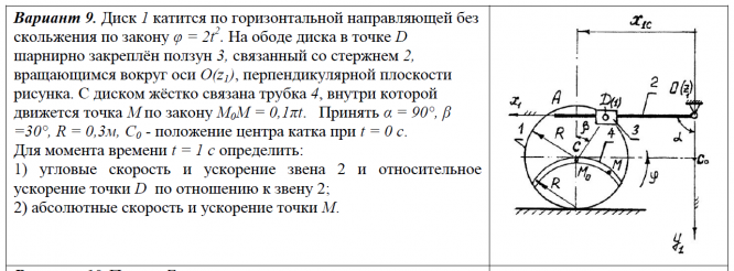 Вариант 9. Диск 1 катится по горизонтальной направляющей без скольжения по закону φ = 2t 2 . На ободе диска в точке D шарнирно закреплён ползун 3, связанный со стержнем 2, вращающимся вокруг оси O(z1), перпендикулярной плоскости рисунка. С диском жёстко связана трубка 4, внутри которой движется точка М по закону M0M = 0,1πt. Принять α = 90°, β =30°, R = 0,3м, С0 - положение центра катка при t = 0 с. Для момента времени t = 1 c определить: 1) угловые скорость и ускорение звена 2 и относительное ускорение точки D по отношению к звену 2; 2) абсолютные скорость и ускорение точки M. .