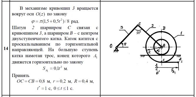 В механизме кривошип 3 вращается вокруг оси O(z) по закону (1,5 0,5 )/8 2     t рад. Шатун 2 шарниром С связан с кривошипом 3, а шарниром В – с центром двухступенчатого катка. Каток катится с проскальзыванием по горизонтальной направляющей. На большую ступень катка намотан трос, конец которого A1 движется горизонтально по закону 2 0,1 1 S t A  м. Принять OC CB  0,8 м, r  0,2 м, R  0,4 м, 1  t с, 0  t 1 с. .
