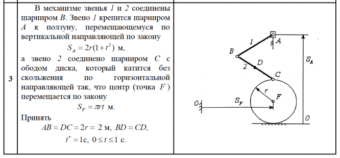 В механизме звенья 1 и 2 соединены шарниром В. Звено 1 крепится шарниром А к ползуну, перемещающемуся по вертикальной направляющей по закону 2 (1 ) 2 S r t A м, а звено 2 соединено шарниром С с ободом диска, который катится без скольжения по горизонтальной направляющей так, что центр (точка F ) перемещается по закону S rt F м. Принять AB DC 2r 2 м, BD CD, t 1с, 0 t 1 с..