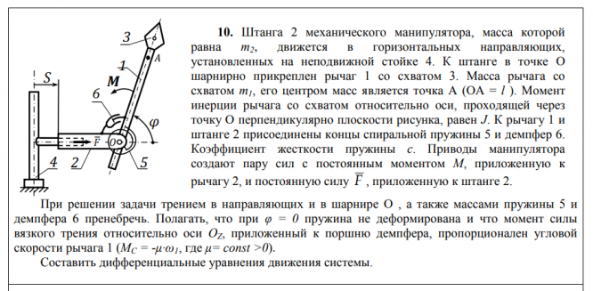 10. Штанга 2 механического манипулятора, масса которой равна m2, движется в горизонтальных направляющих, установленных на неподвижной стойке 4. К штанге в точке O шарнирно прикреплен рычаг 1 со схватом 3. Масса рычага со схватом m1, его центром масс является точка A (OA = l ). Момент инерции рычага со схватом относительно оси, проходящей через точку O перпендикулярно плоскости рисунка, равен J. К рычагу 1 и штанге 2 присоединены концы спиральной пружины 5 и демпфер 6. Коэффициент жесткости пружины с. Приводы манипулятора создают пару сил с постоянным моментом M, приложенную к рычагу 2, и постоянную силу F , приложенную к штанге 2. При решении задачи трением в направляющих и в шарнире O , а также массами пружины 5 и демпфера 6 пренебречь.