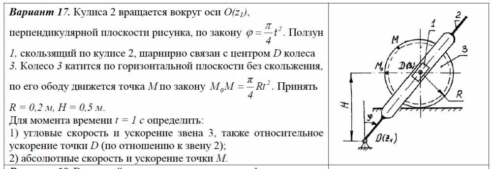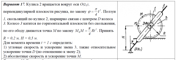 Вариант 17. Кулиса 2 вращается вокруг оси O(z1), перпендикулярной плоскости рисунка, по закону 2 4 t . Ползун 1, скользящий по кулисе 2, шарнирно связан с центром D колеса 3. Колесо 3 катится по горизонтальной плоскости без скольжения, по его ободу движется точка М по закону 2 0 Rt 4 π M M . Принять R = 0,2 м, H = 0,5 м. Для момента времени t = 1 c определить: 1) угловые скорость и ускорение звена 3, также относительное ускорение точки D (по отношению к звену 2); 2) абсолютные скорость и ускорение точки M.