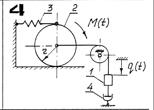 На всех схемах номерами 1, 2 обозначены звенья, массу которых необходимо учитывать при составлении дифференциального уравнения, номером 3 - упругий элемент, номером 4 - демпфер. Силы и моменты воздействия упругих элементов на тела пропорциональны удлинению пружин или углу закручивания спиральных пружин. Демпфер создает силу линейно-вязкого сопротивления R vп    4 , пропорциональную скорости движения поршня п v , где μ4 > 0 - коэффициент сопротивления демпфера. Там, где это необходимо, на схемах вариантов указан радиус инерции звена относительно центральной оси, в остальных вариантах тела вращения принять за однородные сплошные цилиндры. В вариантах 1,2,3,4, 9, 21, 27 характеристики упругих элементов заданы через их статические деформации 3 ст , (линейные или угловые).