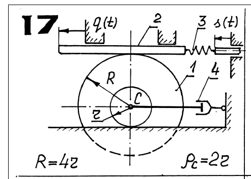 На всех схемах номерами 1, 2 обозначены звенья, массу которых необходимо учитывать при составлении дифференциального уравнения, номером 3 - упругий элемент, номером 4 - демпфер. Силы и моменты воздействия упругих элементов на тела пропорциональны удлинению пружин или углу закручивания спиральных пружин. Демпфер создает силу линейно-вязкого сопротивления R vп 4 , пропорциональную скорости движения поршня п v , где μ4 > 0 - коэффициент сопротивления демпфера. Там, где это необходимо, на схемах вариантов указан радиус инерции звена относительно центральной оси, в остальных вариантах тела вращения принять за однородные сплошные цилиндры. В вариантах 1,2,3,4, 9, 21, 27 характеристики упругих элементов заданы через их статические деформации 3 ст , (линейные или угловые).