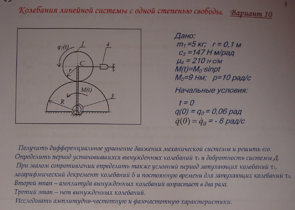Внешнее воздействие во всех вариантах изменяется во времени по закону sinpt. При выполнении домашнего задания "Малые колебания - определение параметров колебательного процесса" необходимо: 1. Составить дифференциальное уравнение малых колебаний системы. 2. Получить решение этого уравнения и, используя заданные начальные условия, определить постоянные интегрирования. 3. Определить период установившихся вынужденных колебаний Tв и добротность системы Д, а для вариантов с малым линейно-вязким сопротивлением (n < k ) дополнительно: Т1 - условный период затухающих колебаний, δ - логарифмический декремент колебаний, τ0- постоянную времени затухающих колебаний. При выполнении домашнего задания "Малые колебания - исследование колебательного процесса" предполагается, что по истечении времени 4Tв + 3/n (4Tв + 3 τ0) амплитуда внешнего воздействия увеличивается в два раза, а еще через такой же промежуток времени внешнее воздействие прекращается.