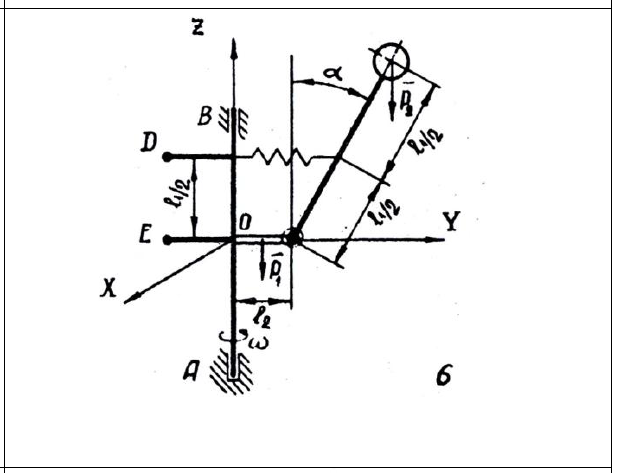Угол α отклонения тела от вертикали и натяжение пружин. 2. Составляющие полных реакций (статические плюс динамические) подпятника A и подшипника B, то есть величины xA, yA, zA, xB, yB . (Пружины не напряжены при угле α = α°, значение которого приводятся в разделе II \"Исходные данные\") Вариант \"б\". При угле α = α° (то есть вместо пружин следует поставить жёсткий стержень) определить: 1. Составляющие динамических реакций подпятника А и подшипника B при заданном угле α. 2. Вес грузов PC, PD и PE (материальных точек), которые надо разместить в точках C, D и E крестовины так, чтобы динамические составляющие реакций подшипников были равны нулю, то есть, чтобы система была динамически уравновешена.