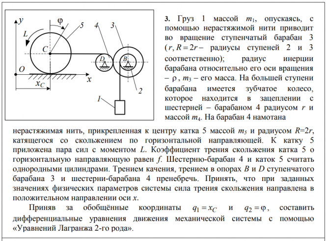 Трением качения, трением в опорах B и D ступенчатого барабана 3 и шестерни-барабана 4 пренебречь. Принять, что при заданных значениях физических параметров системы сила трения скольжения направлена в положительном направлении оси x. Приняв за обобщённые координаты q1 xC и q2 , составить дифференциальные уравнения движения механической системы с помощью «Уравнений Лагранжа 2-го рода»..