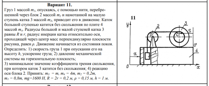 Вариант 11. Груз 1 массой m1, опускаясь, с помощью нити, переброшенной через блок 2 массой т2 и намотанной на малую ступень катка 3 массой m3, приводит его в движение. Каток большой ступенью катится без скольжения по плите 4 массой m4. Радиусы большой и малой ступеней катка 3 равны R и r, радиус инерции катка относительно оси, проходящей через центр масс перпендикулярно плоскости рисунка, равен ρ. Движение начинается из состояния покоя. Определить: 1) скорость груза 1 при опускании его на высоту h, ускорение груза; 2) давление механической системы на горизонтальную плоскость; 3) минимальное значение коэффициента трения скольжения, при котором каток 3 катится без скольжения; 4) реакцию оси блока 2.