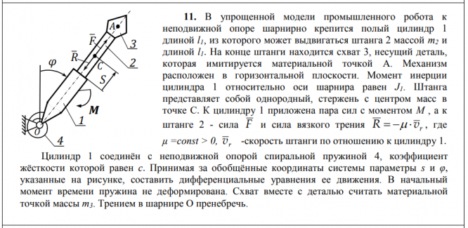 11. В упрощенной модели промышленного робота к неподвижной опоре шарнирно крепится полый цилиндр 1 длиной l1, из которого может выдвигаться штанга 2 массой m2 и длиной l1. На конце штанги находится схват 3, несущий деталь, которая имитируется материальной точкой A. Механизм расположен в горизонтальной плоскости. Момент инерции цилиндра 1 относительно оси шарнира равен J1. Штанга представляет собой однородный, стержень с центром масс в точке C. К цилиндру 1 приложена пара сил с моментом M , а к штанге 2 - сила F и сила вязкого трения R vr , где μ =const > 0, r v -скорость штанги по отношению к цилиндру 1. Цилиндр 1 соединён с неподвижной опорой спиральной пружиной 4, коэффициент жёсткости которой равен c.