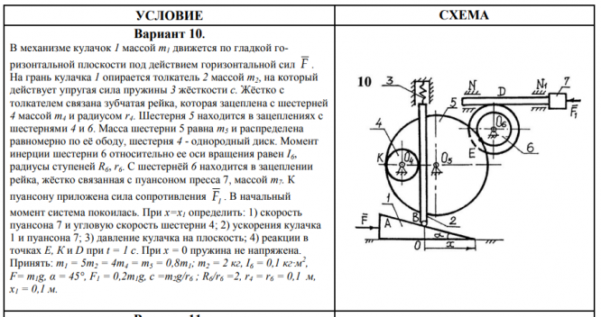 Вариант 10. В механизме кулачок 1 массой т1 движется по гладкой горизонтальной плоскости под действием горизонтальной сил F . На грань кулачка 1 опирается толкатель 2 массой т2, на который действует упругая сила пружины 3 жёсткости с. Жёстко с толкателем связана зубчатая рейка, которая зацеплена с шестерней 4 массой т4 и радиусом r4. Шестерня 5 находится в зацеплениях с шестернями 4 и 6. Масса шестерни 5 равна т5 и распределена равномерно по её ободу, шестерня 4 - однородный диск. Момент инерции шестерни 6 относительно ее оси вращения равен I6, радиусы ступеней R6, r6. С шестернёй 6 находится в зацеплении рейка, жёстко связанная с пуансоном пресса 7, массой т7.