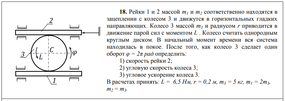 18. Рейки 1 и 2 массой m1 и m2 соответственно находятся в зацеплении с колесом 3 и движутся в горизонтальных гладких направляющих. Колесо 3 массой m3 и радиусом r приводится в движение парой сил с моментом L . Колесо считать однородным круглым диском. В начальный момент времени вся система находилась в покое. После того, как колесо 3 сделает один оборот φ = 2π рад определить: 1) скорость рейки 2; 2) угловую скорость колеса 3; 3) угловое ускорение колеса 3. В расчетах принять: L = 6,5 Нм, r = 0,2 м, m3 = 5 кг, m1 = 2m3, m2 = m3. .