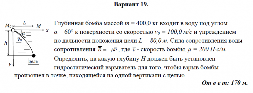 Глубинная бомба массой т = 400,0 кг входит в воду под углом α = 60° к поверхности со скоростью v0 = 100,0 м/с и упреждением по дальности положения цели L = 80,0 м. Сила сопротивления воды сопротивления R v , где v - скорость бомбы, μ = 200 Н·с/м. Определить, на какую глубину Н должен быть установлен гидростатический взрыватель для того, чтобы взрыв бомбы произошел в точке, находящейся на одной вертикали с целью. От в е т: 170 м..