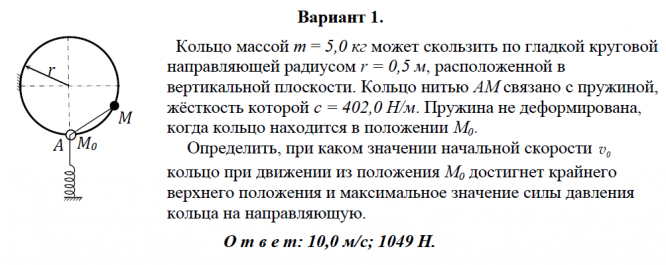 Кольцо массой т = 5,0 кг может скользить по гладкой круговой направляющей радиусом r = 0,5 м, расположенной в вертикальной плоскости. Кольцо нитью АМ связано с пружиной, жёсткость которой с = 402,0 Н/м. Пружина не деформирована, когда кольцо находится в положении М0. Определить, при каком значении начальной скорости 0 v кольцо при движении из положения М0 достигнет крайнего верхнего положения и максимальное значение силы давления кольца на направляющую. О т в е т: 10,0 м/с; 1049 Н..