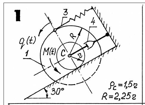 На всех схемах номерами 1, 2 обозначены звенья, массу которых необходимо учитывать при составлении дифференциального уравнения, номером 3 - упругий элемент, номером 4 - демпфер. Силы и моменты воздействия упругих элементов на тела пропорциональны удлинению пружин или углу закручивания спиральных пружин. Демпфер создает силу линейно-вязкого сопротивления R vп    4 , пропорциональную скорости движения поршня п v , где μ4 > 0 - коэффициент сопротивления демпфера. Там, где это необходимо, на схемах вариантов указан радиус инерции звена относительно центральной оси, в остальных вариантах тела вращения принять за однородные сплошные цилиндры. В вариантах 1,2,3,4, 9, 21, 27 характеристики упругих элементов заданы через их статические деформации 3 ст , (линейные или угловые).