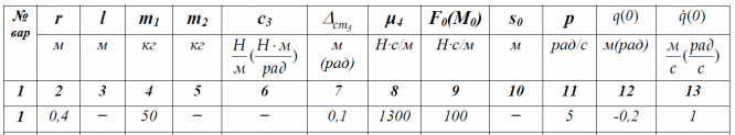 Колебания линейной системы с одной степенью свободы. Авторы Ильин М. М., Пожалостин А. А., Тушева Г. М. Издательство МГТУ им. Н. Э. Баумана 2002 год. УСЛОВИЯ ДОМАШНИХ ЗАДАНИЙ Рассматриваются малые колебания механической системы с одной степенью свободы около положения устойчивого равновесия. Механические системы представляют собой плоские механизмы, расположенные в вертикальной плоскости и состоящие из твёрдых тел, нитей, демпферов и упругих элементов. Необходимые числовые данные приведены в таблице и, где это необходимо, на схемах задач. Для всех вариантов на схемах задана обобщённая координата q(t) , отсчитываемая от положения равновесия в невозмущенном состоянии, а в таблице - соответствующие ей начальные условия.