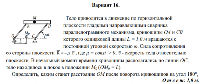 Тело приводится в движение по горизонтальной плоскости гладкими направляющими спарника параллелограммного механизма, кривошипы ОА и СВ которого одинаковой длины L = 1,0 м вращаются с постоянной угловой скоростью ω. Сила сопротивления co стороны плоскости R v , где μ = const > 0, v - скорость тела относительно плоскости. В начальный момент времени кривошипы располагались по линии ОС, тело находилось в покое в положении М0 (OM0 = L). Определить, каким станет расстояние ОМ после поворота кривошипов на угол 180°, О т в е т: 1,0 м..