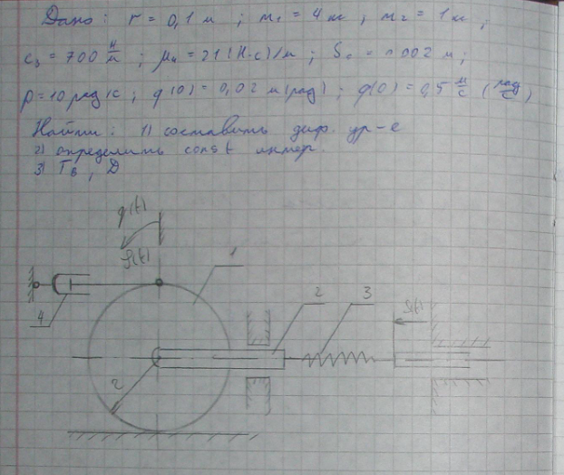 На всех схемах номерами 1, 2 обозначены звенья, массу которых необходимо учитывать при составлении дифференциального уравнения, номером 3 - упругий элемент, номером 4 - демпфер. Силы и моменты воздействия упругих элементов на тела пропорциональны удлинению пружин или углу закручивания спиральных пружин. Демпфер создает силу линейно-вязкого сопротивления R vп 4 , пропорциональную скорости движения поршня п v , где μ4 > 0 - коэффициент сопротивления демпфера. Там, где это необходимо, на схемах вариантов указан радиус инерции звена относительно центральной оси, в остальных вариантах тела вращения принять за однородные сплошные цилиндры. В вариантах 1,2,3,4, 9, 21, 27 характеристики упругих элементов заданы через их статические деформации 3 ст , (линейные или угловые).