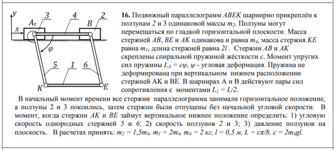 16. Подвижный параллелограмм ABEK шарнирно прикреплён к ползунам 2 и 3 одинаковой массы m2. Ползуны могут перемещаться по гладкой горизонтальной плоскости. Масса стержней AB, BE и AK одинакова и равна m4, масса стержня KE равна m1, длина стержней равна 2l . Стержни AB и AK скреплены спиральной пружиной жёсткости c. Момент упругих сил пружины LA = cψ, ψ - угловая деформация. Пружина не деформирована при вертикальном нижнем расположении стержней AK и BE. В шарнирах A и B действуют пары cил сопротивления с моментами L1 = L/2. В начальный момент времени все стержни параллелограмма занимали горизонтальное положение, а ползуны 2 и 3 покоились, затем стержни были отпущены без начальной угловой скорости.
