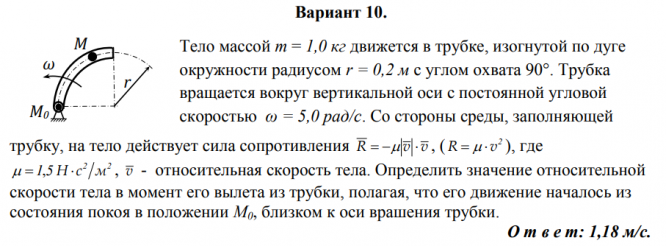 Тело массой т = 1,0 кг движется в трубке, изогнутой по дуге окружности радиусом r = 0,2 м с углом охвата 90°. Трубка вращается вокруг вертикальной оси с постоянной угловой скоростью ω = 5,0 рад/с. Со стороны среды, заполняющей трубку, на тело действует сила сопротивления R   v v , ( 2 R   v ), где 2 2   1,5 Н с м , v - относительная скорость тела. Определить значение относительной скорости тела в момент его вылета из трубки, полагая, что его движение началось из состояния покоя в положении М0, близком к оси врашения трубки. О т в е т: 1,18 м/с..