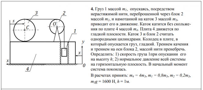4. Груз 1 массой m1, опускаясь, посредством нерастяжимой нити, переброшенной через блок 2 массой m2, и намотанной на каток 3 массой m3, приводит его в движение. Каток катится без скольжения по плите 4 массой m4. Плита 4 движется по гладкой плоскости. Каток 3 и блок 2 считать однородными цилиндрами. Колодец в плите, в который опускается груз, гладкий. Трением качения и трением на оси блока 2, массой нити пренебречь. Определить: 1) скорость груза 1при опускании его на высоту h; 2) нормальное давление всей системы на горизонтальную плоскость. В начальный момент система покоилась. В расчетах принять: m4 = 4m3, m1 = 0,8m3, m2 = 0,2m3, m3g = 1600 Н, h = 1м.