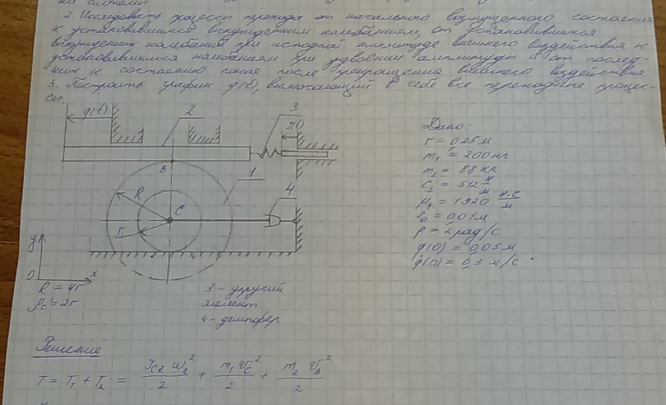 Внешнее воздействие во всех вариантах изменяется во времени по закону sinpt. При выполнении домашнего задания "Малые колебания - определение параметров колебательного процесса" необходимо: 1. Составить дифференциальное уравнение малых колебаний системы. 2. Получить решение этого уравнения и, используя заданные начальные условия, определить постоянные интегрирования. 3. Определить период установившихся вынужденных колебаний Tв и добротность системы Д, а для вариантов с малым линейно-вязким сопротивлением (n < k ) дополнительно: Т1 - условный период затухающих колебаний, δ - логарифмический декремент колебаний, τ0- постоянную времени затухающих колебаний. При выполнении домашнего задания "Малые колебания - исследование колебательного процесса" предполагается, что по истечении времени 4Tв + 3/n (4Tв + 3 τ0) амплитуда внешнего воздействия увеличивается в два раза, а еще через такой же промежуток времени внешнее воздействие прекращается.