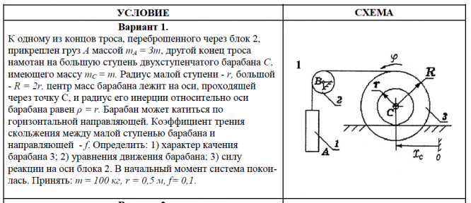 Вариант 1. К одному из концов троса, переброшенного через блок 2, прикреплен груз А массой тA = Зm, другой конец троса намотан на большую ступень двухступенчатого барабана С, имеющего массу тC = т. Радиус малой ступени - r, большой - R = 2r, центр масс барабана лежит на оси, проходящей через точку С, и радиус его инерции относительно оси барабана равен ρ = r. Барабан может катиться по горизонтальной направляющей. Коэффициент трения скольжения между малой ступенью барабана и направляющей - f. Определить: 1) характер качения барабана 3; 2) уравнения движения барабана; 3) силу реакции на оси блока 2. В начальный момент система покоилась. Принять: т = 100 кг, r = 0,5 м, f= 0,1..