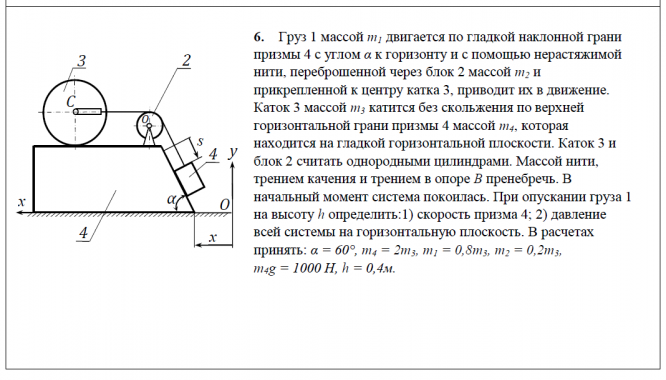 6. Груз 1 массой m1 двигается по гладкой наклонной грани призмы 4 с углом α к горизонту и с помощью нерастяжимой нити, переброшенной через блок 2 массой m2 и прикрепленной к центру катка 3, приводит их в движение. Каток 3 массой m3 катится без скольжения по верхней горизонтальной грани призмы 4 массой m4, которая находится на гладкой горизонтальной плоскости. Каток 3 и блок 2 считать однородными цилиндрами. Массой нити, трением качения и трением в опоре B пренебречь. В начальный момент система покоилась. При опускании груза 1 на высоту h определить:1) скорость призма 4; 2) давление всей системы на горизонтальную плоскость. В расчетах принять: α = 60°, m4 = 2m3, m1 = 0,8m3, m2 = 0,2m3, m4g = 1000 Н, h = 0,4м. .