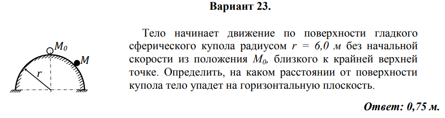 Тело начинает движение по поверхности гладкого сферического купола радиусом r = 6,0 м без начальной скорости из положения М0, близкого к крайней верхней точке. Определить, на каком расстоянии от поверхности купола тело упадет на горизонтальную плоскость. Ответ: 0,75 м.