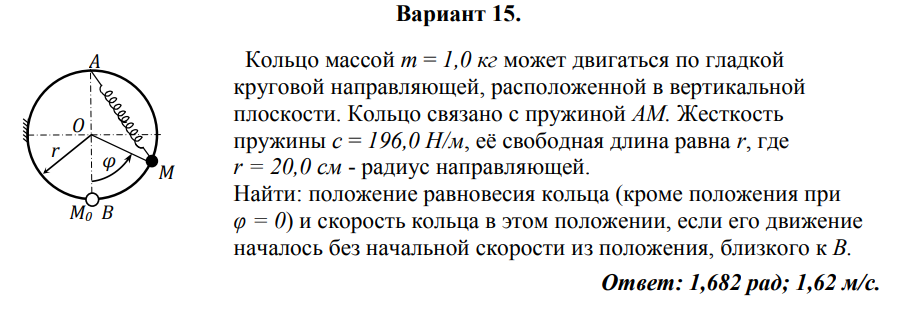Кольцо массой т = 1,0 кг может двигаться по гладкой круговой направляющей, расположенной в вертикальной плоскости. Кольцо связано с пружиной АМ. Жесткость пружины с = 196,0 Н/м, её свободная длина равна r, где r = 20,0 см - радиус направляющей. Найти: положение равновесия кольца (кроме положения при φ = 0) и скорость кольца в этом положении, если его движение началось без начальной скорости из положения, близкого к В.  Ответ: 1,682 рад; 1,62 м/с..