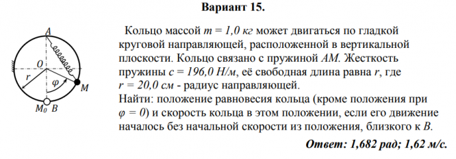 Кольцо массой т = 1,0 кг может двигаться по гладкой круговой направляющей, расположенной в вертикальной плоскости. Кольцо связано с пружиной АМ. Жесткость пружины с = 196,0 Н/м, её свободная длина равна r, где r = 20,0 см - радиус направляющей. Найти: положение равновесия кольца (кроме положения при φ = 0) и скорость кольца в этом положении, если его движение началось без начальной скорости из положения, близкого к В. Ответ: 1,682 рад; 1,62 м/с..