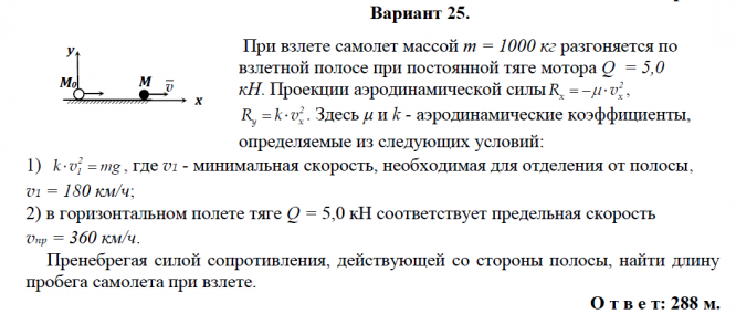 При взлете самолет массой т = 1000 кг разгоняется по взлетной полосе при постоянной тяге мотора Q = 5,0 кН. Проекции аэродинамической силы 2 Rx vx    , 2 y vx R  k  . Здесь μ и k - аэродинамические коэффициенты, определяемые из следующих условий: 1) mg 2 k v1  , где v1 - минимальная скорость, необходимая для отделения от полосы, v1 = 180 км/ч; 2) в горизонтальном полете тяге Q = 5,0 кН соответствует предельная скорость vпр = 360 км/ч. Пренебрегая силой сопротивления, действующей со стороны полосы, найти длину пробега самолета при взлете..