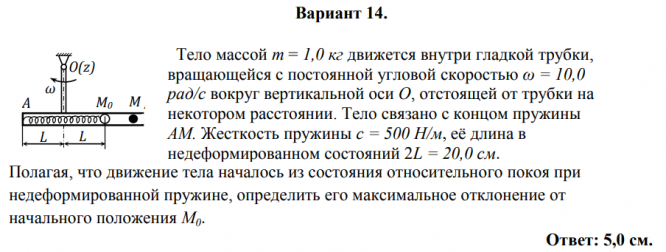 Тело массой т = 1,0 кг движется внутри гладкой трубки, вращающейся с постоянной угловой скоростью ω = 10,0 рад/с вокруг вертикальной оси О, отстоящей от трубки на некотором расстоянии. Тело связано с концом пружины АМ. Жесткость пружины с = 500 Н/м, её длина в недеформированном состояний 2L = 20,0 см. Полагая, что движение тела началось из состояния относительного покоя при недеформированной пружине, определить его максимальное отклонение от начального положения М0. Ответ: 5,0 см..