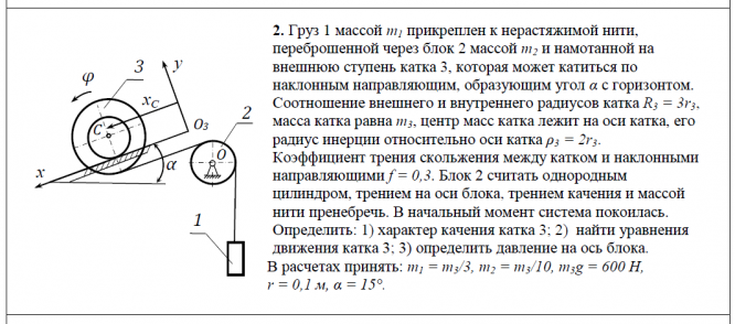 2. Груз 1 массой m1 прикреплен к нерастяжимой нити, переброшенной через блок 2 массой m2 и намотанной на внешнюю ступень катка 3, которая может катиться по наклонным направляющим, образующим угол α с горизонтом. Соотношение внешнего и внутреннего радиусов катка R3 = 3r3, масса катка равна m3, центр масс катка лежит на оси катка, его радиус инерции относительно оси катка ρ3 = 2r3. Коэффициент трения скольжения между катком и наклонными направляющими f = 0,3. Блок 2 считать однородным цилиндром, трением на оси блока, трением качения и массой нити пренебречь. В начальный момент система покоилась. Определить: 1) характер качения катка 3; 2) найти уравнения движения катка 3; 3) определить давление на ось блока.