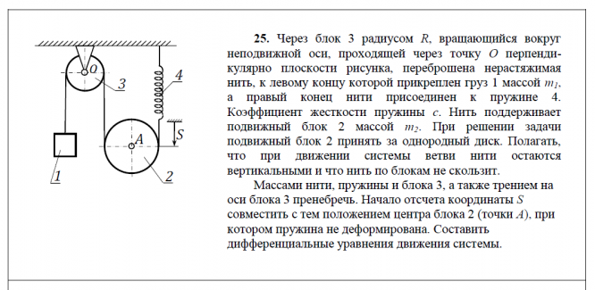 25. Через блок 3 радиусом R, вращающийся вокруг неподвижной оси, проходящей через точку O перпендикулярно плоскости рисунка, переброшена нерастяжимая нить, к левому концу которой прикреплен груз 1 массой m1, а правый конец нити присоединен к пружине 4. Коэффициент жесткости пружины c. Нить поддерживает подвижный блок 2 массой m2. При решении задачи подвижный блок 2 принять за однородный диск. Полагать, что при движении системы ветви нити остаются вертикальными и что нить по блокам не скользит. Массами нити, пружины и блока 3, а также трением на оси блока 3 пренебречь. Начало отсчета координаты S совместить с тем положением центра блока 2 (точки A), при котором пружина не деформирована.