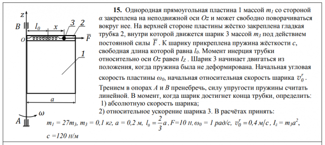 15. Однородная прямоугольная пластина 1 массой m1 со стороной α закреплена на неподвижной оси Oz и может свободно поворачиваться вокруг нее. На верхней стороне пластины жёстко закреплена гладкая трубка 2, внутри которой движется шарик 3 массой m3 под действием постоянной силы F . К шарику прикреплена пружина жёсткости c, свободная длина которой равна l0. Момент инерция трубки относительно оси Oz равен IZ . Шарик 3 начинает двигаться из положения, когда пружина была не деформирована. Начальная угловая скорость пластины ω0, начальная относительная скорость шарика r v0 . Трением в опорах A и B пренебречь, силу упругости пружины считать линейной. В момент, когда шарик достигнет конца трубки, определить: 1) абсолютную скорость шарика; 2) относительное ускорение шарика 3.
