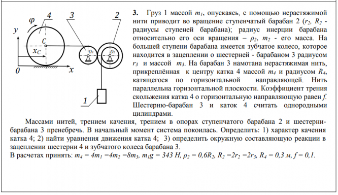 3. Груз 1 массой m1, опускаясь, с помощью нерастяжимой нити приводит во вращение ступенчатый барабан 2 (r2, R2 - радиусы ступеней барабана); радиус инерции барабана относительно его оси вращения – ρ2, m2 - его масса. На большей ступени барабана имеется зубчатое колесо, которое находится в зацеплении о шестерней - барабаном 3 радиусом r3 и массой m3. На барабан 3 намотана нерастяжимая нить, прикреплённая к центру катка 4 массой m4 и радиусом R4, катящегося по горизонтальной направляющей. Нить параллельна горизонтальной плоскости. Коэффициент трения скольжения катка 4 о горизонтальную направляющую равен f. Шестерню-барабан 3 и каток 4 считать однородными цилиндрами.  Массами нитей, трением качения, трением в опорах ступенчатого барабана 2 и шестернибарабана 3 пренебречь.