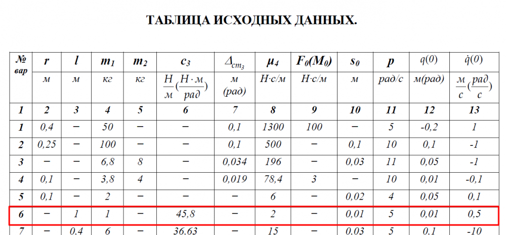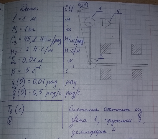 Колебания линейной системы с одной степенью свободы. Авторы Ильин М. М., Пожалостин А. А., Тушева Г. М. Издательство МГТУ им. Н. Э. Баумана 2002 год. УСЛОВИЯ ДОМАШНИХ ЗАДАНИЙ Рассматриваются малые колебания механической системы с одной степенью свободы около положения устойчивого равновесия. Механические системы представляют собой плоские механизмы, расположенные в вертикальной плоскости и состоящие из твёрдых тел, нитей, демпферов и упругих элементов. Необходимые числовые данные приведены в таблице и, где это необходимо, на схемах задач. Для всех вариантов на схемах задана обобщённая координата q(t) , отсчитываемая от положения равновесия в невозмущенном состоянии, а в таблице - соответствующие ей начальные условия.