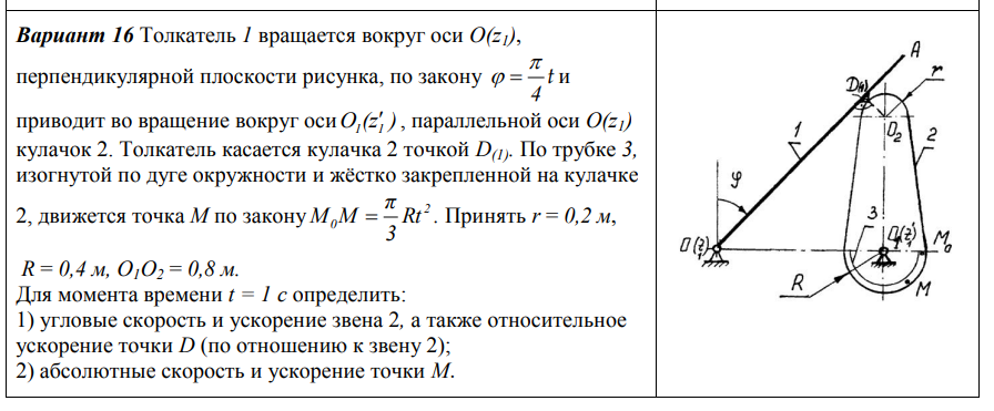 Вариант 16 Толкатель 1 вращается вокруг оси O(z1), перпендикулярной плоскости рисунка, по закону t 4 и приводит во вращение вокруг оси O (z ) 1 1 , параллельной оси O(z1) кулачок 2. Толкатель касается кулачка 2 точкой D(1). По трубке 3, изогнутой по дуге окружности и жёстко закрепленной на кулачке 2, движется точка М по закону 2 0 Rt 3 π M M . Принять r = 0,2 м, R = 0,4 м, O1O2 = 0,8 м. Для момента времени t = 1 c определить: 1) угловые скорость и ускорение звена 2, а также относительное ускорение точки D (по отношению к звену 2); 2) абсолютные скорость и ускорение точки M. .