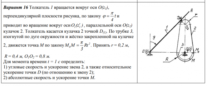 Вариант 16 Толкатель 1 вращается вокруг оси O(z1), перпендикулярной плоскости рисунка, по закону t 4    и приводит во вращение вокруг оси O (z ) 1 1  , параллельной оси O(z1) кулачок 2. Толкатель касается кулачка 2 точкой D(1). По трубке 3, изогнутой по дуге окружности и жёстко закрепленной на кулачке 2, движется точка М по закону 2 0 Rt 3 π M M  . Принять r = 0,2 м, R = 0,4 м, O1O2 = 0,8 м. Для момента времени t = 1 c определить: 1) угловые скорость и ускорение звена 2, а также относительное ускорение точки D (по отношению к звену 2); 2) абсолютные скорость и ускорение точки M. .
