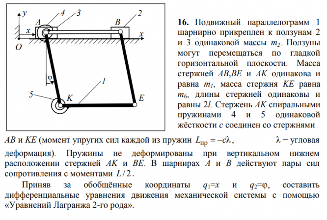 16. Подвижный параллелограмм 1 шарнирно прикреплен к ползунам 2 и 3 одинаковой массы m2. Ползуны могут перемещаться по гладкой горизонтальной плоскости. Масса стержней AB,BE и AK одинакова и равна m1, масса стержня KE равна m6, длины стержней одинаковы и равны 2l. Стержень AK спиральными пружинами 4 и 5 одинаковой жёсткости c соединен со стержнями AB и KE (момент упругих сил каждой из пружин L cλ пр , λ − угловая деформация). Пружины не деформированы при вертикальном нижнем расположении стержней AK и BE. В шарнирах A и B действуют пары сил сопротивления с моментами L/ 2 . Приняв за обобщённые координаты q1=x и q2=, составить дифференциальные уравнения движения механической системы с помощью «Уравнений Лагранжа 2-го рода»..