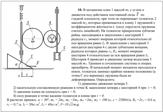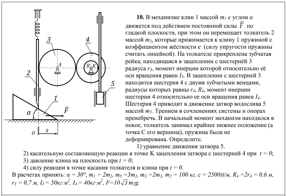 10. В механизме клин 1 массой m1 с углом α движется под действием постоянной силы F по гладкой плоскости, при этом он перемещает толкатель 2 массой m2, которые прижимается к клину 1 пружиной с коэффициентом жёсткости c (силу упругости пружины считать линейной). На толкателе прикреплена зубчатая рейка, находящаяся в зацеплении с шестернёй 3 радиуса r3, момент инерции которой относительно её оси вращения равен I3. В зацеплении с шестерней 3 находится шестерня 4 с двумя зубчатыми венцами, радиусы которых равны r4, R4, момент инерции шестерни 4 относительно ее оси вращения равен I4. Шестерня 4 приводит в движение затвор водослива 5 массой m5. Трением в сочленениях системы и опорах пренебречь.