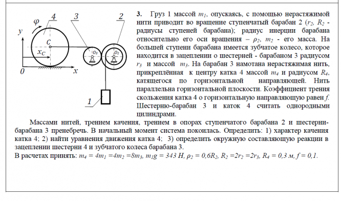 3. Груз 1 массой m1, опускаясь, с помощью нерастяжимой нити приводит во вращение ступенчатый барабан 2 (r2, R2 - радиусы ступеней барабана); радиус инерции барабана относительно его оси вращения – ρ2, m2 - его масса. На большей ступени барабана имеется зубчатое колесо, которое находится в зацеплении о шестерней - барабаном 3 радиусом r3 и массой m3. На барабан 3 намотана нерастяжимая нить, прикреплённая к центру катка 4 массой m4 и радиусом R4, катящегося по горизонтальной направляющей. Нить параллельна горизонтальной плоскости. Коэффициент трения скольжения катка 4 о горизонтальную направляющую равен f. Шестерню-барабан 3 и каток 4 считать однородными цилиндрами.  Массами нитей, трением качения, трением в опорах ступенчатого барабана 2 и шестернибарабана 3 пренебречь.