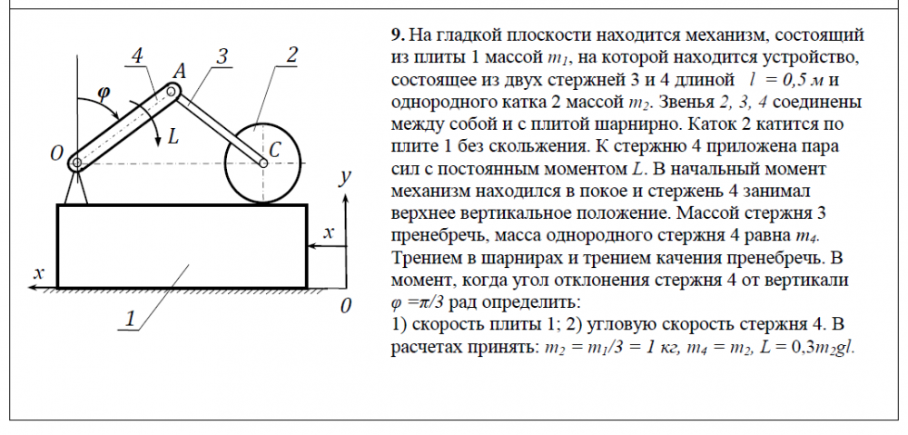 9. На гладкой плоскости находится механизм, состоящий из плиты 1 массой m1, на которой находится устройство, состоящее из двух стержней 3 и 4 длиной l = 0,5 м и однородного катка 2 массой m2. Звенья 2, 3, 4 соединены между собой и с плитой шарнирно. Каток 2 катится по плите 1 без скольжения. К стержню 4 приложена пара сил с постоянным моментом L. В начальный момент механизм находился в покое и стержень 4 занимал верхнее вертикальное положение. Массой стержня 3 пренебречь, масса однородного стержня 4 равна т4. Трением в шарнирах и трением качения пренебречь. В момент, когда угол отклонения стержня 4 от вертикали φ =π/3 рад определить: 1) скорость плиты 1; 2) угловую скорость стержня 4.