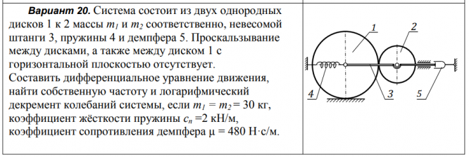 Вариант 20. Система состоит из двух однородных дисков 1 к 2 массы m1 и m2 соответственно, невесомой штанги 3, пружины 4 и демпфера 5. Проскальзывание между дисками, а также между диском 1 с горизонтальной плоскостью отсутствует. Составить дифференциальное уравнение движения, найти собственную частоту и логарифмический декремент колебаний системы, если m1 = m2 = 30 кг, коэффициент жёсткости пружины сп =2 кН/м, коэффициент сопротивления демпфера µ = 480 Н·с/м..