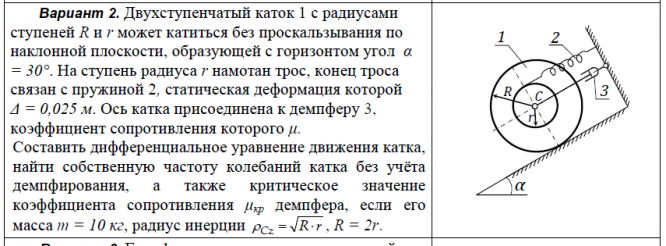 Вариант 2. Двухступенчатый каток 1 с радиусами ступеней R и r может катиться без проскальзывания по наклонной плоскости, образующей с горизонтом угол α = 30°. На ступень радиуса r намотан трос, конец троса связан с пружиной 2, статическая деформация которой Δ = 0,025 м. Ось катка присоединена к демпферу 3, коэффициент сопротивления которого μ. Составить дифференциальное уравнение движения катка, найти собственную частоту колебаний катка без учёта демпфирования, а также критическое значение коэффициента сопротивления μкр демпфера, если его масса m = 10 кг, радиус инерции Cz  R r , R = 2r..