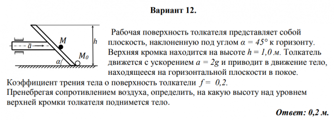 Рабочая поверхность толкателя представляет собой плоскость, наклоненную под углом α = 45° к горизонту. Верхняя кромка находится на высоте h = 1,0 м. Толкатель движется с ускорением а = 2g и приводит в движение тело, находящееся на горизонтальной плоскости в покое Коэффициент трения тела о поверхность толкатели f = 0,2. Пренебрегая сопротивлением воздуха, определить, на какую высоту над уровнем верхней кромки толкателя поднимется тело. Ответ: 0,2 м..