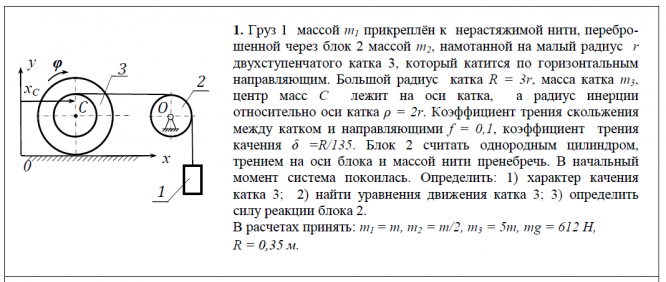 1. Груз 1 массой m1 прикреплён к нерастяжимой нити, переброшенной через блок 2 массой m2, намотанной на малый радиус r двухступенчатого катка 3, который катится по горизонтальным направляющим. Большой радиус катка R = 3r, масса катка m3, центр масс C лежит на оси катка, а радиус инерции относительно оси катка ρ = 2r. Коэффициент трения скольжения между катком и направляющими f = 0,1, коэффициент трения качения δ =R/135. Блок 2 считать однородным цилиндром, трением на оси блока и массой нити пренебречь. В начальный момент система покоилась. Определить: 1) характер качения катка 3; 2) найти уравнения движения катка 3; 3) определить силу реакции блока 2. В расчетах принять: m1 = m, m2 = m/2, m3 = 5m, mg = 612 Н, R = 0,35 м. .