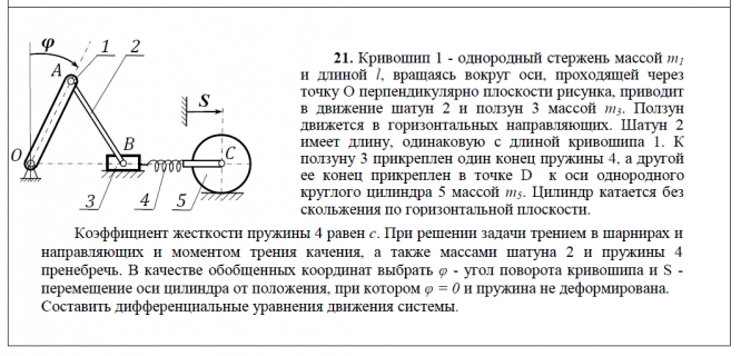 21. Кривошип 1 - однородный стержень массой m1 и длиной l, вращаясь вокруг оси, проходящей через точку O перпендикулярно плоскости рисунка, приводит в движение шатун 2 и ползун 3 массой m3. Ползун движется в горизонтальных направляющих. Шатун 2 имеет длину, одинаковую с длиной кривошипа 1. К ползуну 3 прикреплен один конец пружины 4, а другой ее конец прикреплен в точке D к оси однородного круглого цилиндра 5 массой m5. Цилиндр катается без скольжения по горизонтальной плоскости. Коэффициент жесткости пружины 4 равен c. При решении задачи трением в шарнирах и направляющих и моментом трения качения, а также массами шатуна 2 и пружины 4 пренебречь. В качестве обобщенных координат выбрать φ - угол поворота кривошипа и S - перемещение оси цилиндра от положения, при котором φ = 0 и пружина не деформирована.