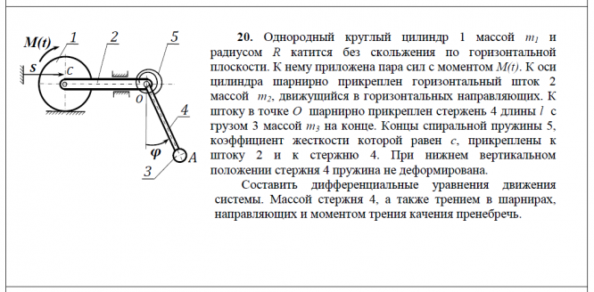 20. Однородный круглый цилиндр 1 массой m1 и радиусом R катится без скольжения по горизонтальной плоскости. К нему приложена пара сил с моментом M(t). К оси цилиндра шарнирно прикреплен горизонтальный шток 2 массой m2, движущийся в горизонтальных направляющих. К штоку в точке O шарнирно прикреплен стержень 4 длины l с грузом 3 массой m3 на конце. Концы спиральной пружины 5, коэффициент жесткости которой равен c, прикреплены к штоку 2 и к стержню 4. При нижнем вертикальном положении стержня 4 пружина не деформирована. Составить дифференциальные уравнения движения системы. Массой стержня 4, а также трением в шарнирах, направляющих и моментом трения качения пренебречь..
